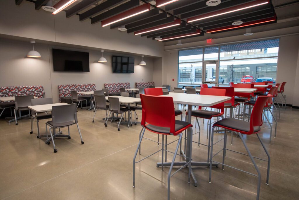 Another highlight on the new campus is the employee lounge, which is “a really fun space because there’s a mix of lounge and bar-height seating,” Tufvesson said. “It’s also very flexible furniture, so if they have an event, they can push tables out of the way to accommodate all types of uses.”