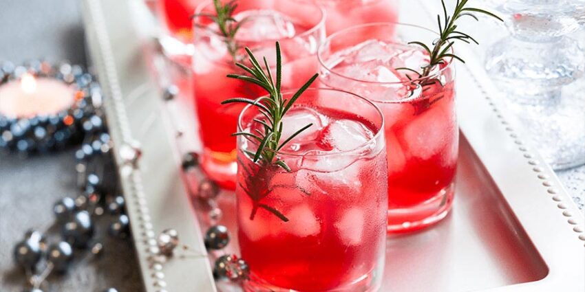 Muddle pomegranate seeds and cranberries together in a glass. Add ice and pour in cranberry or raspberry flavored sparkling water, add one to two ounces of diet cranberry juice, and stir. Pour into wine glass and garnish with a rosemary sprig.