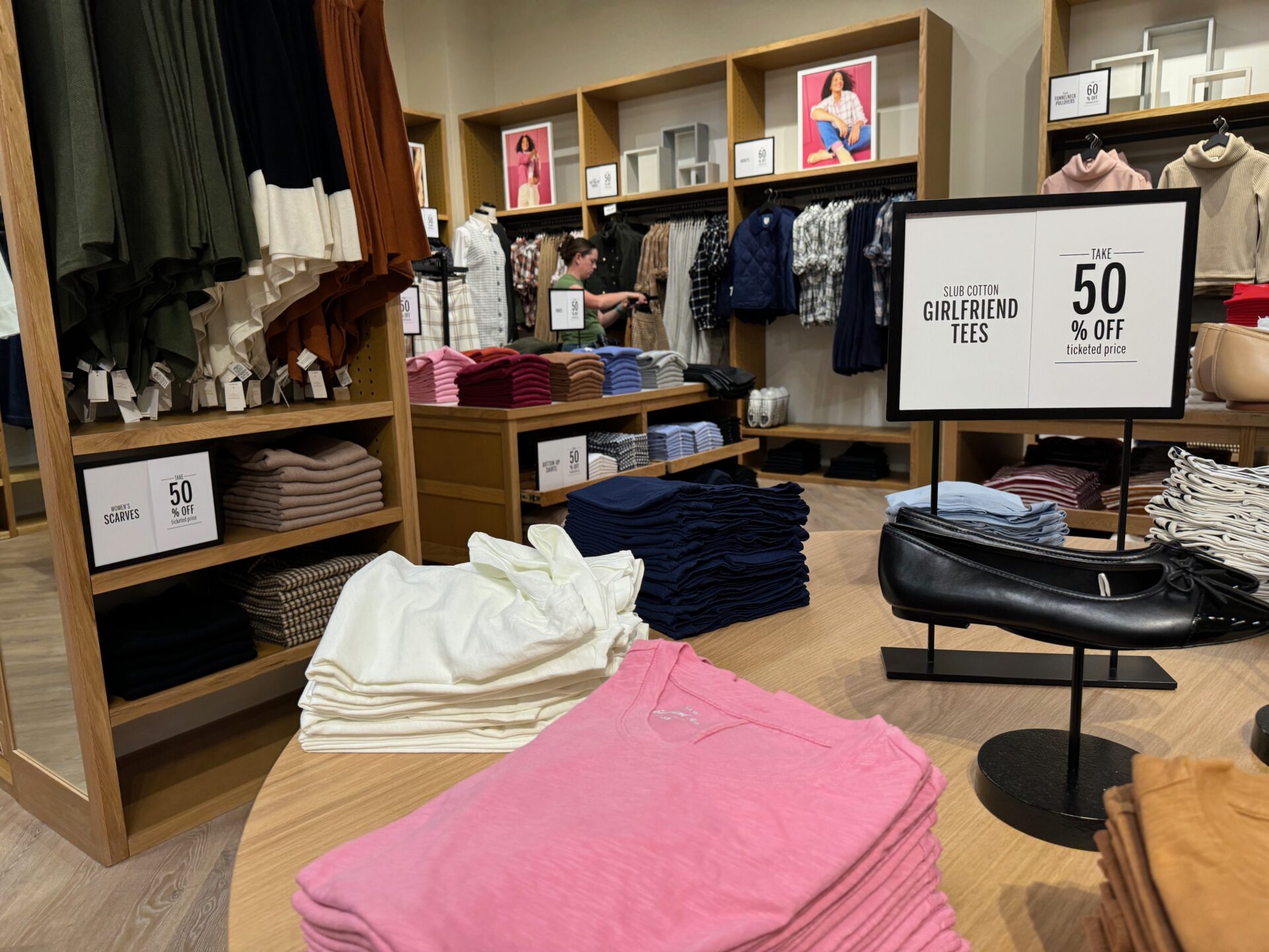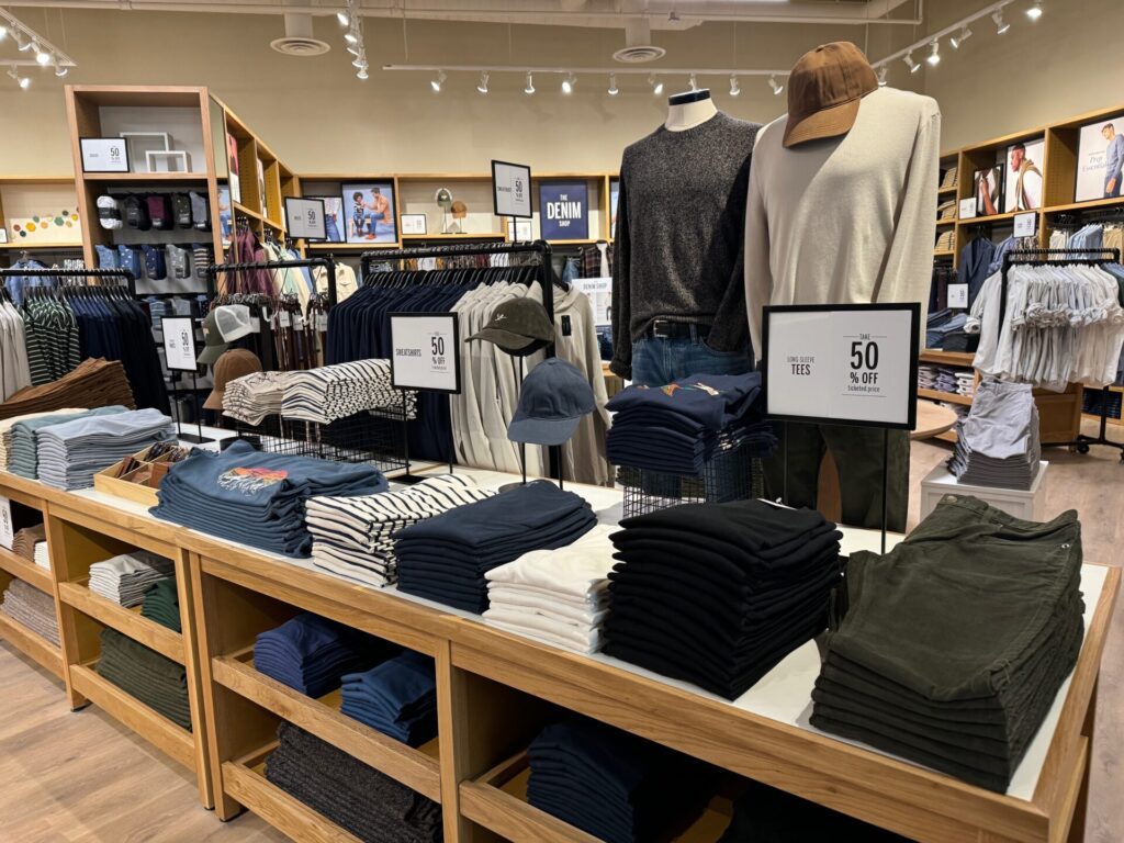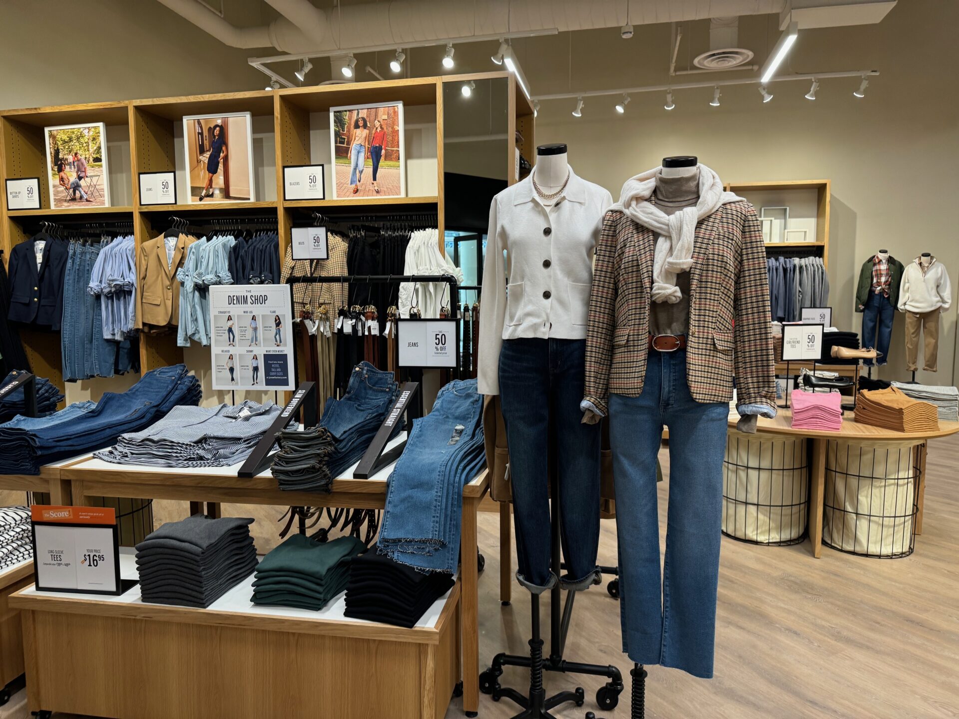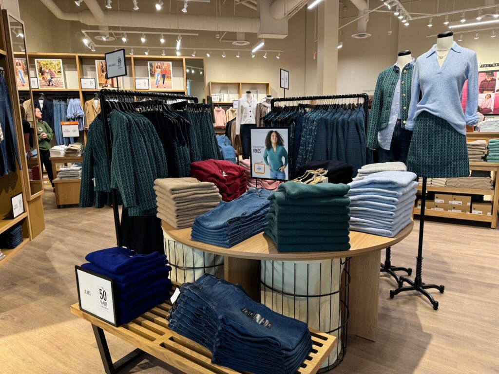 The store is merchandised for fall and winter, with denim, sweaters, blazers and accessories.