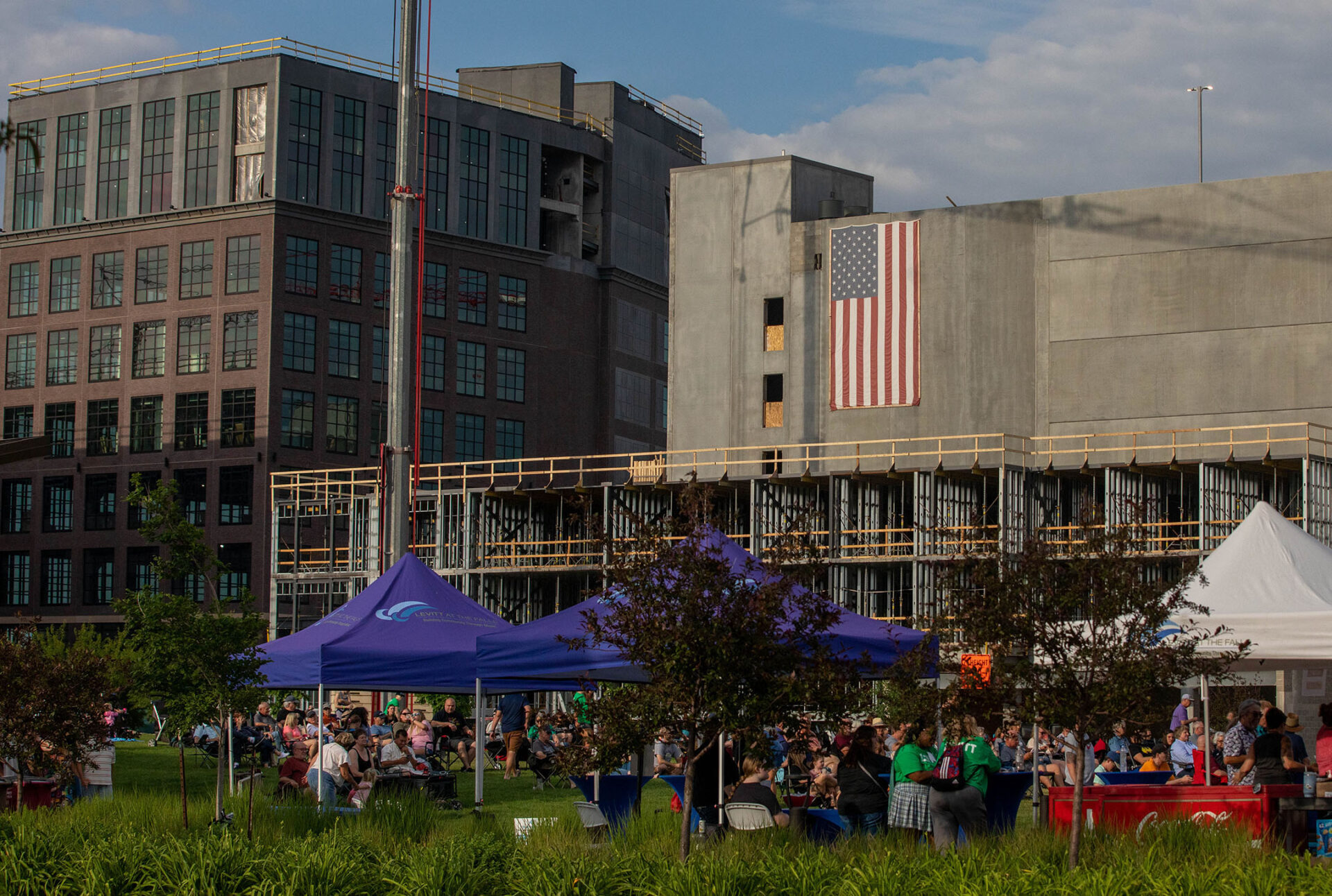I don’t remember the first time I noticed the flag, hanging from the unfinished parking ramp that was the first structure to rise up at The Steel District.