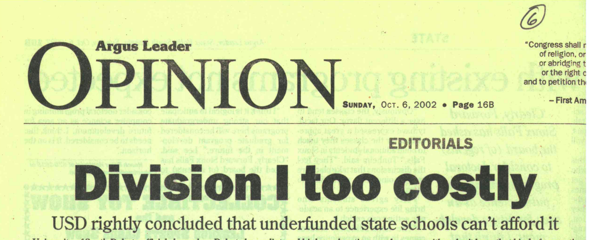 He had plenty of company, including the editorial board of the Argus Leader, which came out with the headline: “Division I too costly” and praised USD for choosing not to consider a Division I move.