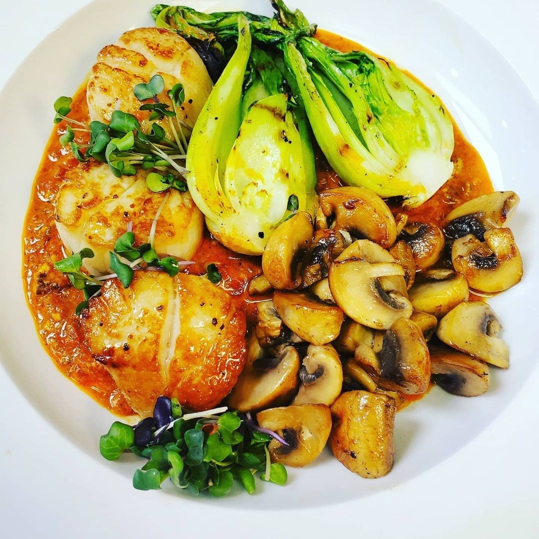 The Scallops & Romanesco dish includes pan-seared Maine scallops, grilled baby bok choy, sauteed oyster mushrooms and a red pepper Romanesco sauce.