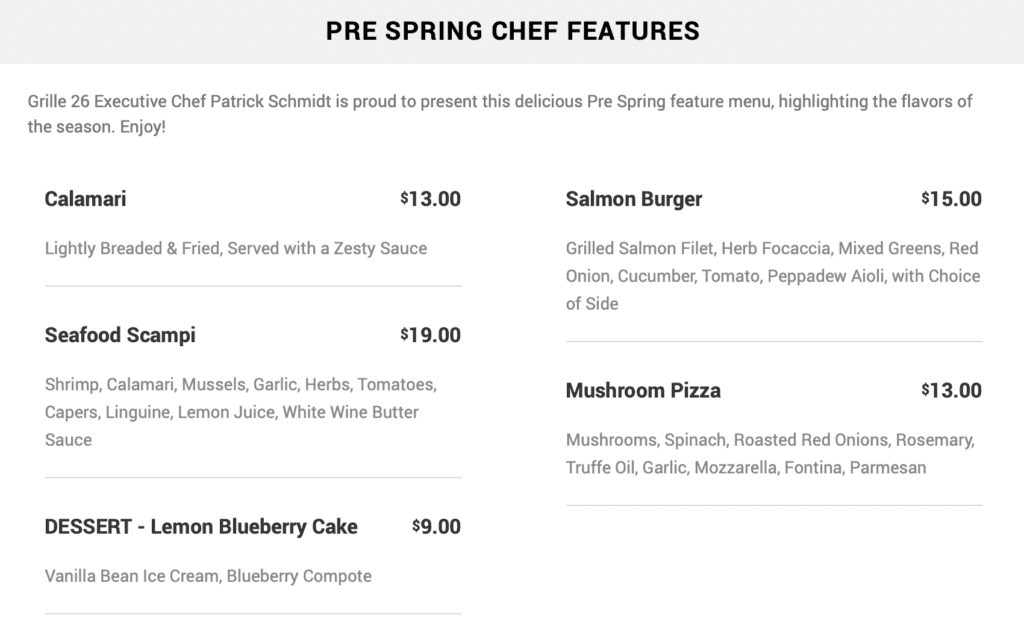 From a grilled salmon burger to a signature Grille 26 pizza, vegetarian-style, there’s something for the whole family.