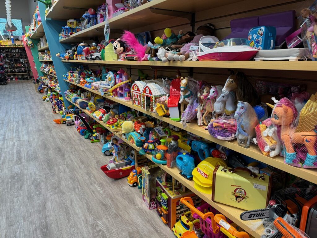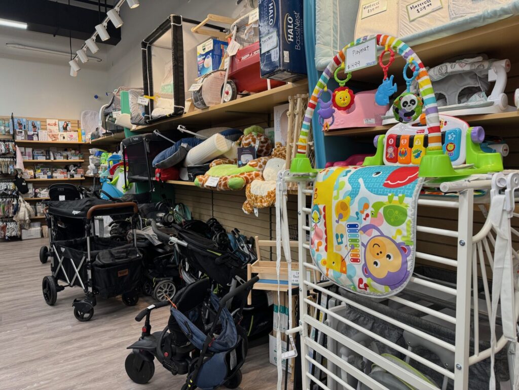 There’s also “a huge wall of toys for all ages, including dinosaurs, Legos, puzzles, dollhouses and many new toys,” she continued. “So much kids equipment! Pack-and-plays, strollers, swings, sit-me-ups, walkers, bassinets, play pens, bikes, wagons and more.”