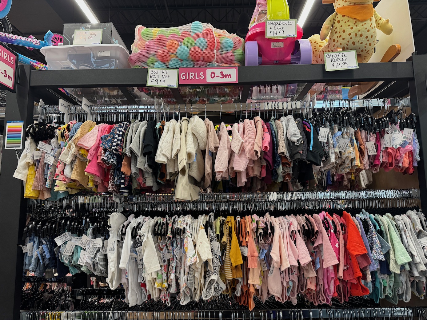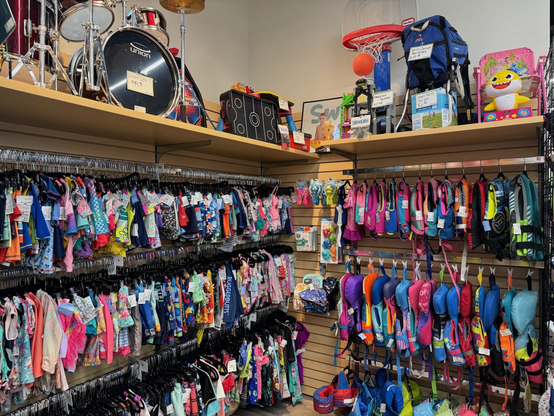Opening day brought an inventory of clothing for boys and girls from preemie and newborn through teen sizes, as well as a large selection of shoes from infant through adult, including sports cleats and dance shoes. For summer fun, there are swimsuits, coverups and life jackets.