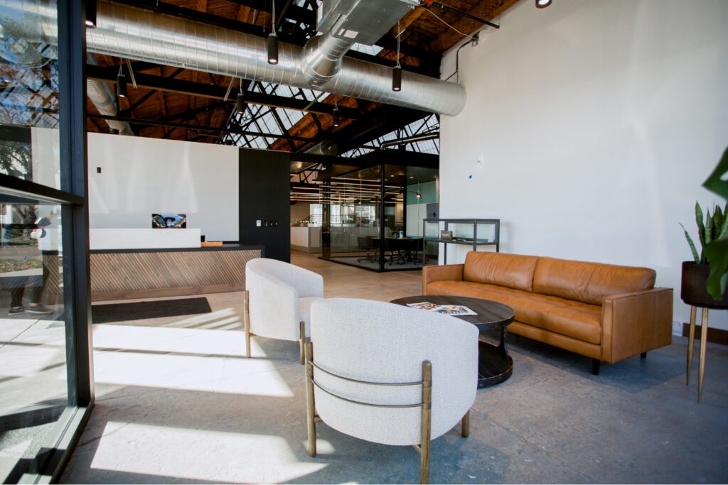 The renovated space features a modern industrial aesthetic with lots of glass, metal, polished concrete floors and an open-concept layout with a central bullpen where team members are stationed. The ceiling has been restored to its original wood, and large skylights have been installed in the vaulted roof.