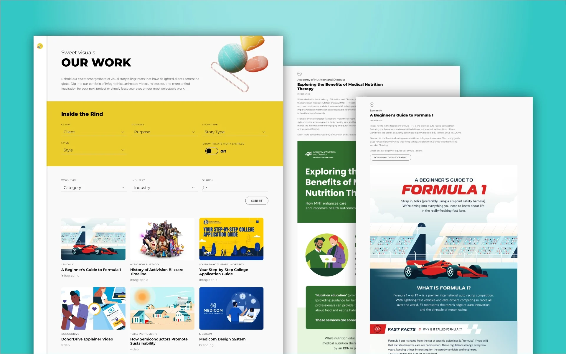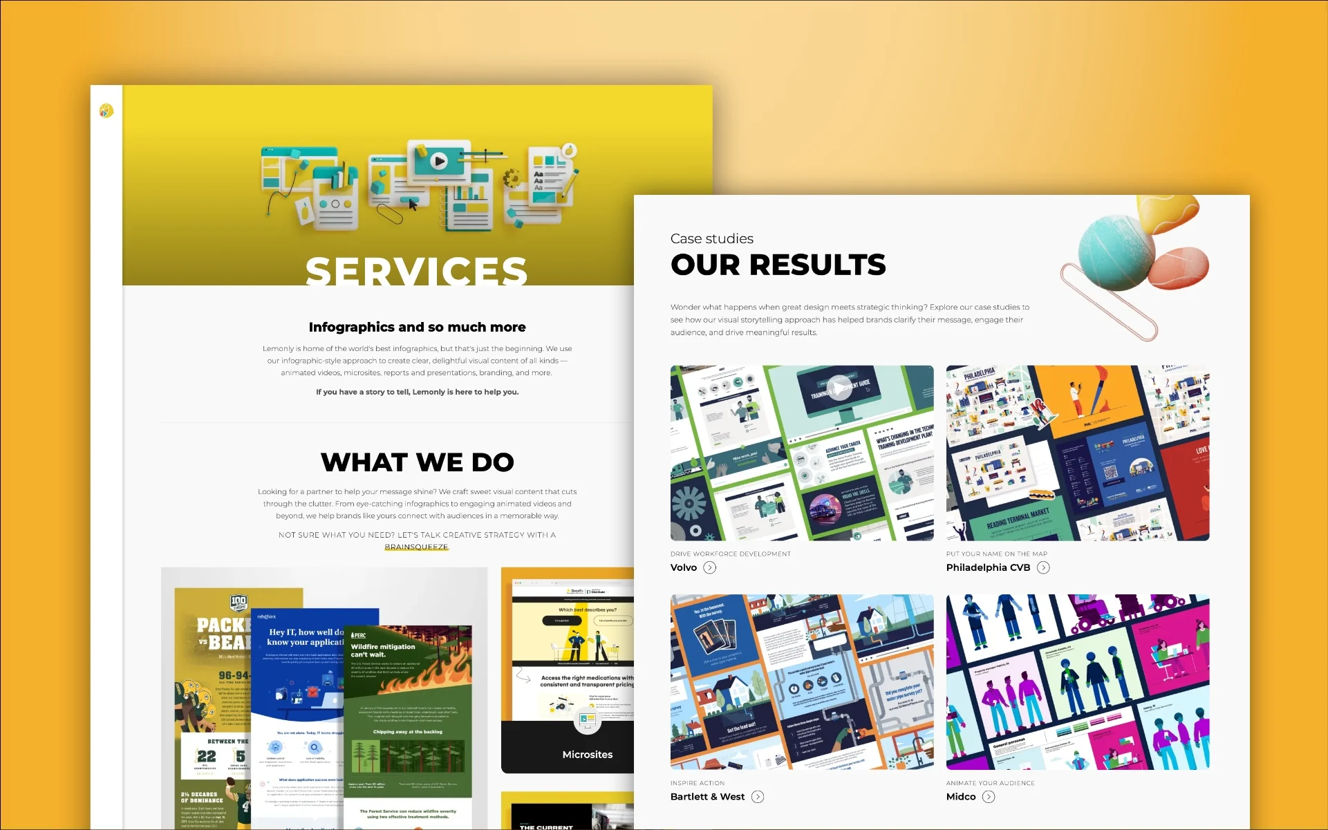 Lemonly’s website is uniquely suited for presenting the company’s extensive portfolio of visual content. These “sweet visuals” take many forms: static and animated infographics, videos, reports, presentations, interactive microsites, branding and more. As a showcase for Lemonly’s capabilities, the site needs to display multiple file types, handle large image sizes and do it all while loading quickly and prioritizing accessibility.
