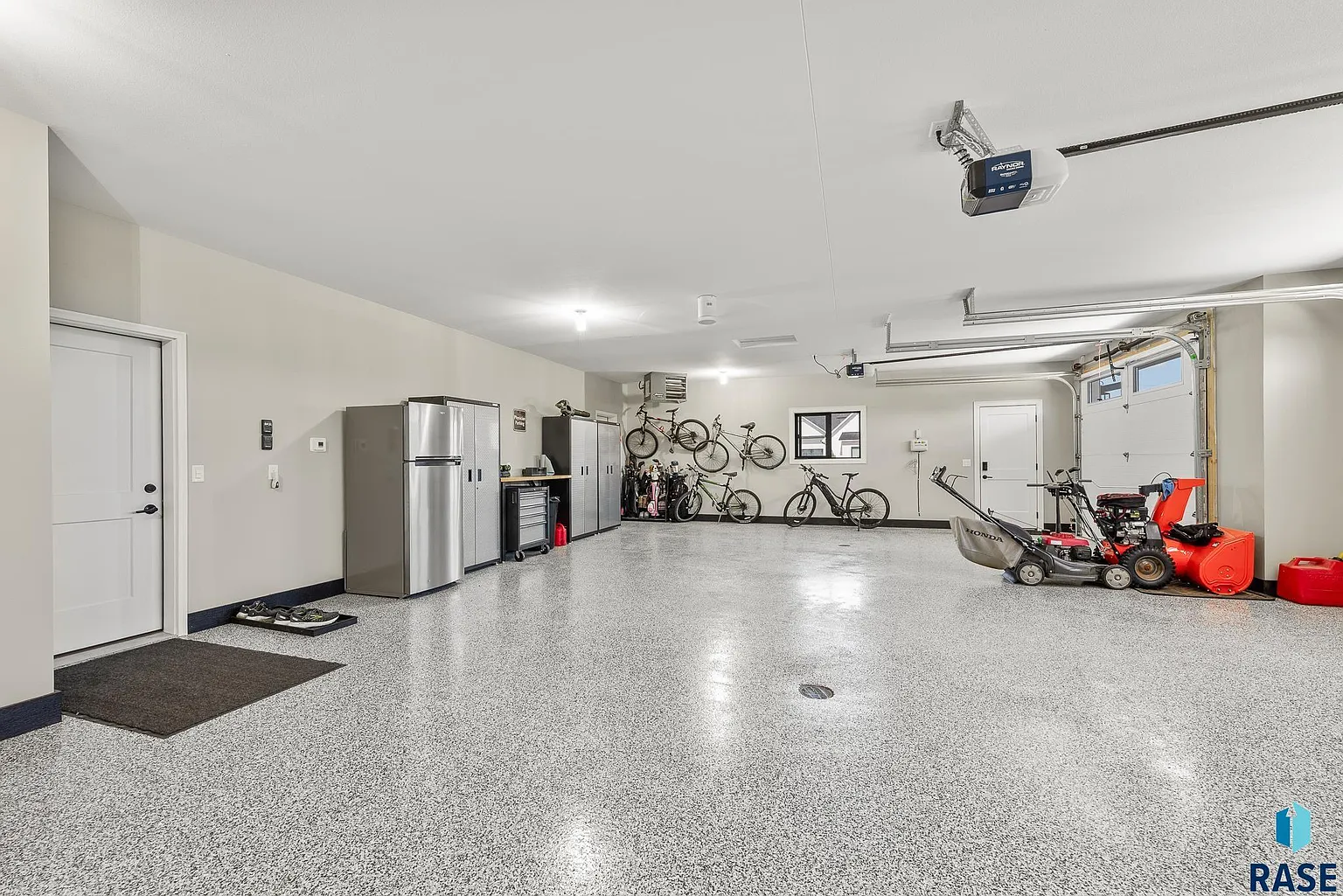 The three-stall garage offers finished walls, water hookups, drains and gas heat. Reinforced utility room walls can serve as a storm shelter as needed.