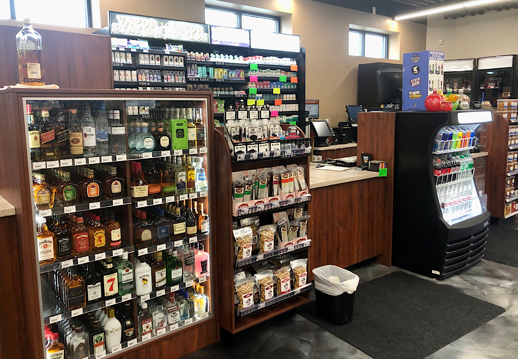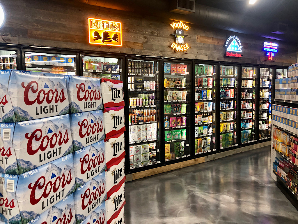 The store features a walk-in beer cave, and there’s a 10-door cooler for six-packs and “tall boys” of beer and four-packs of seltzers.