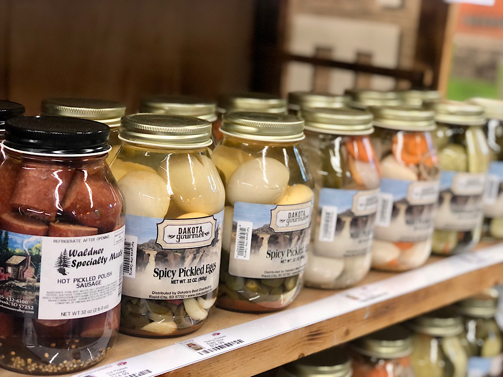 Shelves hold salty snacks, and there are pickled goods for making bloody marys.