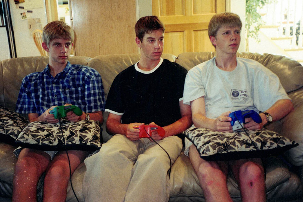 John Bergan, Jeff Wilde and Michael Bergan play an N64 game in 2000.