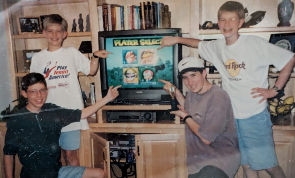 John Bergan (upper left) and Michael Bergan (upper right) pose in front of a TV screen showing Mario Kart 64 in the late 1990s with their friends Matt Havlik (lower left) and Larry Moose (lower right). Moose is holding the trophy that he won for taking first place in the battle mode competition. All four of them are pointing to the character they played as.