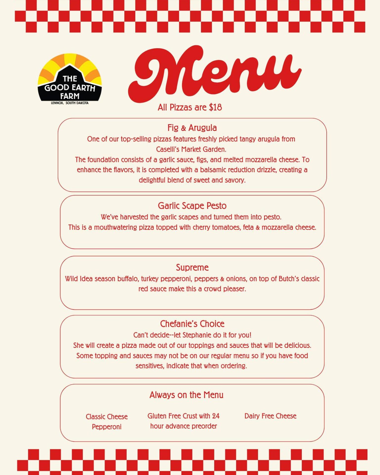 “Our menu changes weekly depending on what produce is available from our fields and from other local growers,” co-owner Nancy Kirstein said. “We always have cheese, turkey pepperoni and some option with Wild Idea Buffalo.”