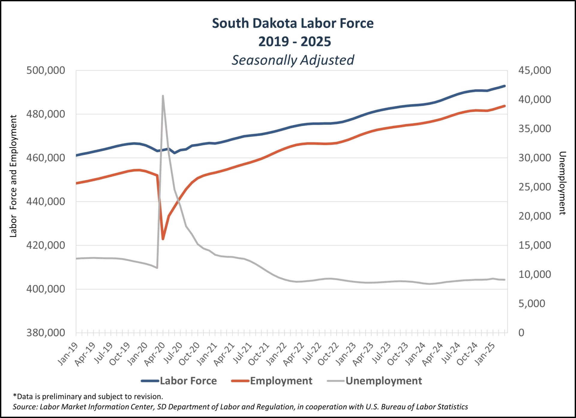 In April, South Dakota’s labor force rose by 700 people to 493,600 from the previous month. A year ago, it was 486,300.