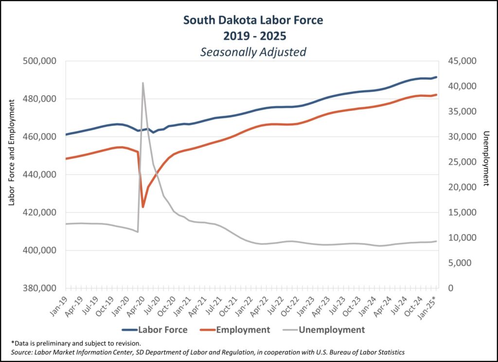 In January, South Dakota’s labor force rose by 4,300 people to 491,500 from the previous month. A year ago, it was 484,400.