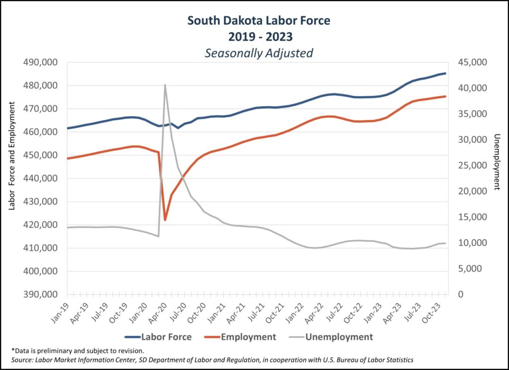 In November, South Dakota’s labor force also was unchanged at 485,200. A year ago, it was 475,000.