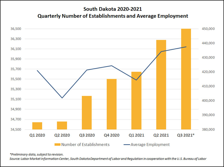 South Dakota employers reported a gain of 3,280 workers in the most recent quarter, which ended in September, reaching 437,476. The state set a record in June with 442,525 workers.