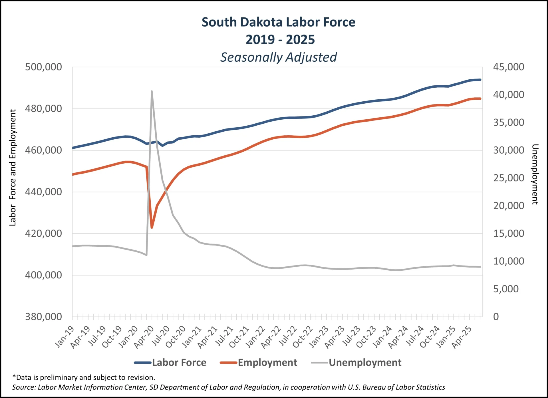 In June, South Dakota’s labor force rose by 300 people to 493,900 from the previous month. A year ago, it was 488,300.