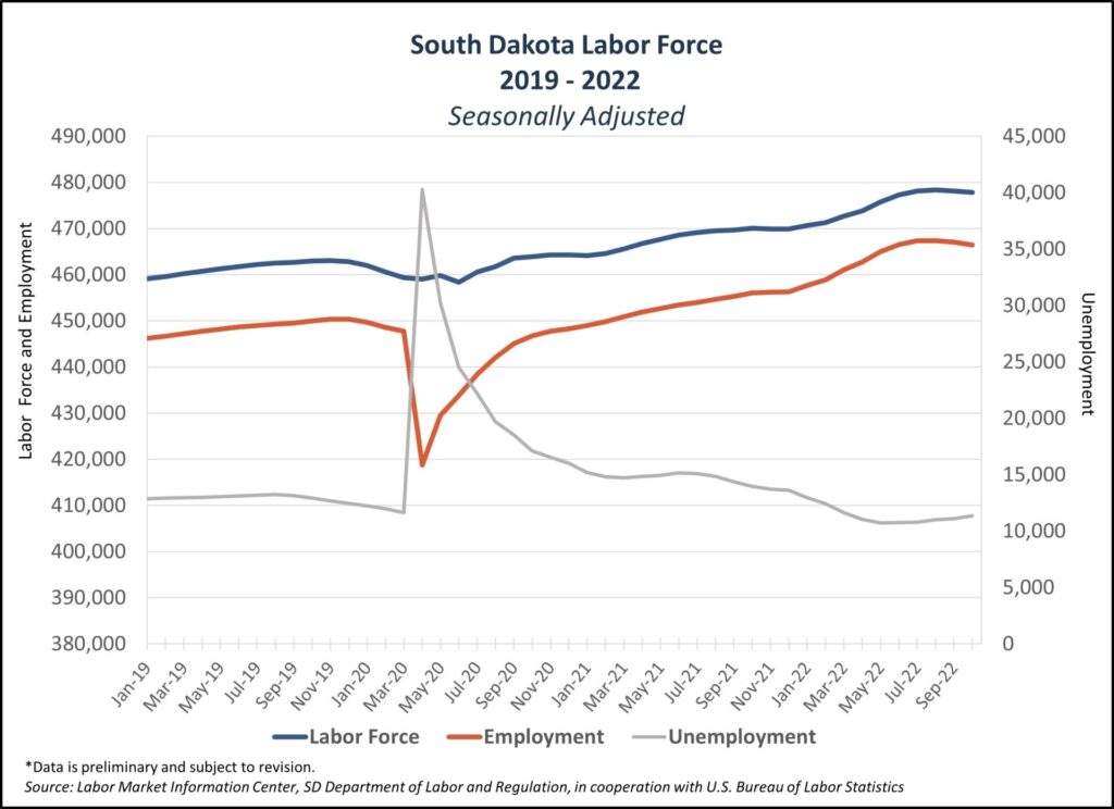 The total labor force for the Sioux Falls MSA, those who are employed and unemployed, was 164,219 in October, basically flat from 164,531 in September.