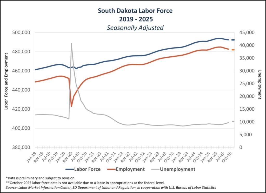 In November, South Dakota’s labor force was 492,300. A year ago, it was 490,800.