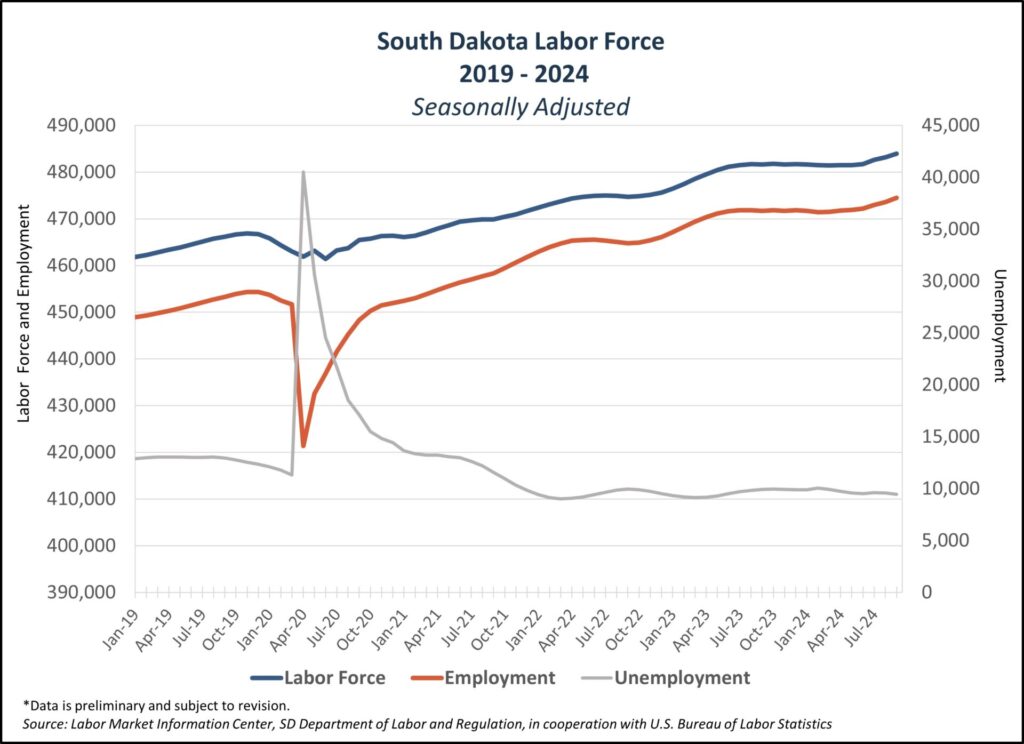 In September, South Dakota’s labor force rose by 700 people to 484,000 from the previous month. A year ago, it was 481,600.