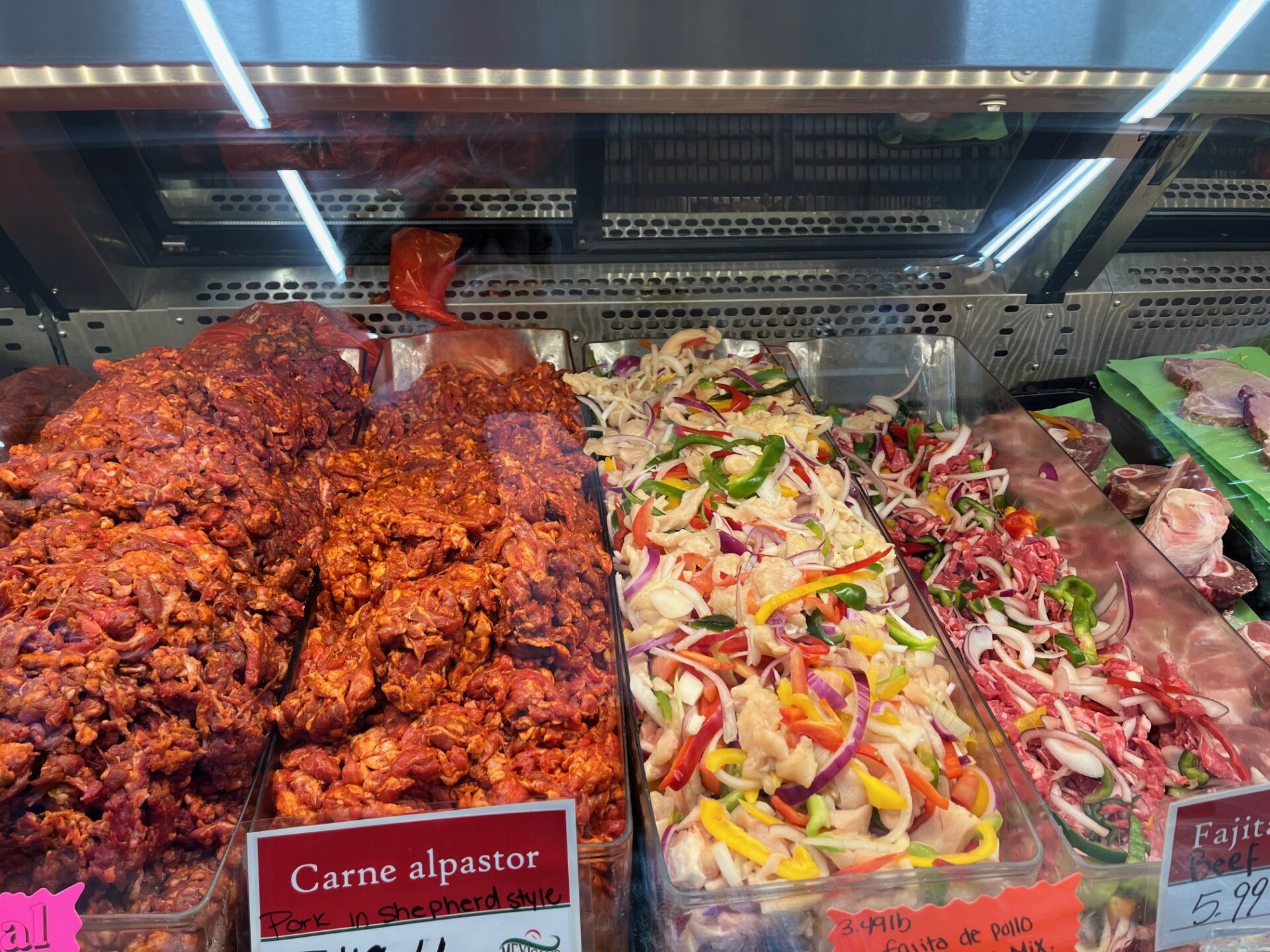 The store offers fresh-cut fruit from its produce department, which offers a wide selection of peppers and harder-to-find items such as dragon fruit, chayote and nance, an El Salvadorean fruit that resembles a cherry and is both tart and sweet. Meat market displays include fajita mixtures.