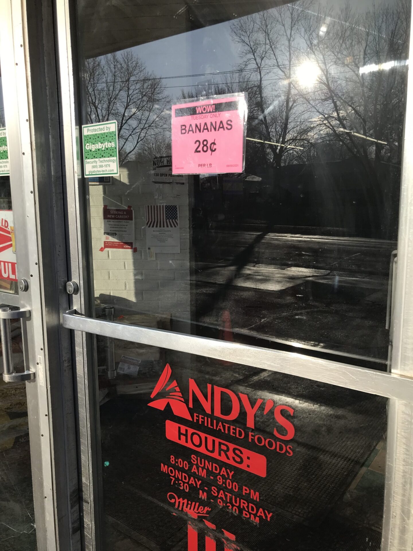 The sign in pink paper taped to the entrance door at Andy’s Affiliated Foods announces Tuesday’s special: bananas at 28 cents a pound.