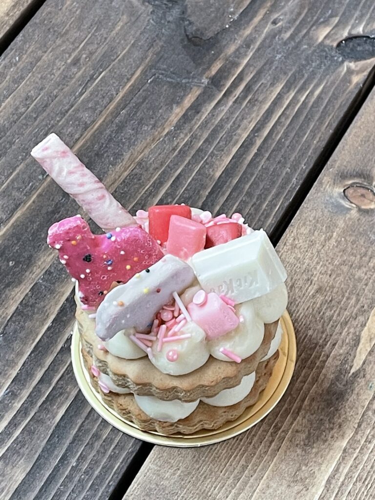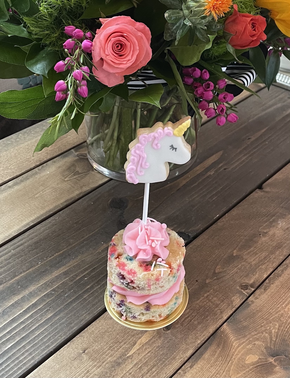 Here’s a vanilla confetti cake with a sugar cookie topper.