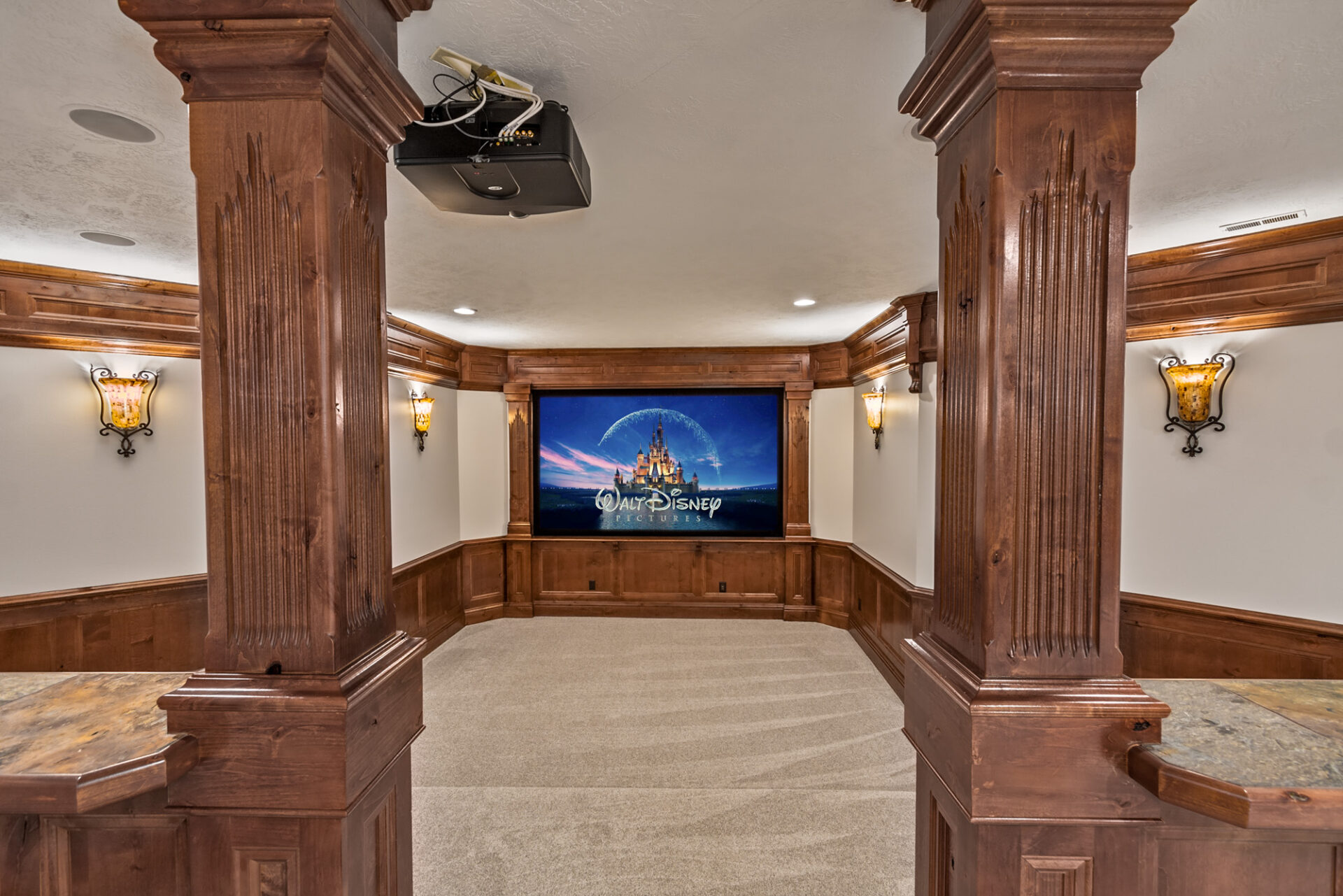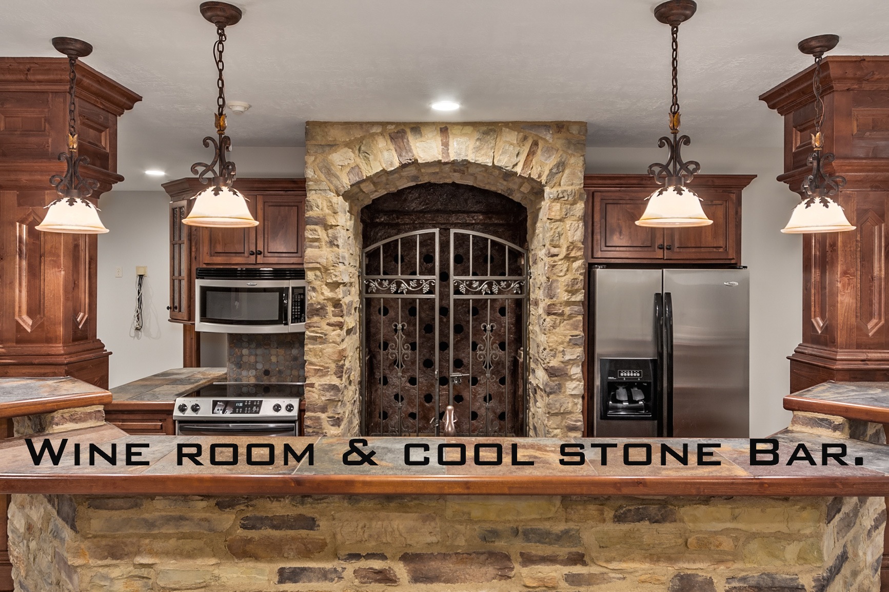 And the lower level is just as fabulous as the rest of the home, featuring a fun stone bar, wine room and theater room.