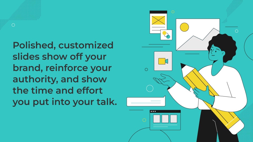 Polished, customized slides show off your brand — whether it’s your company’s brand or your personal brand as an executive or subject matter expert. They also reinforce your authority and show you put time and effort into your talk. Even a custom pattern or icon set can add a little something to your conference slide deck.