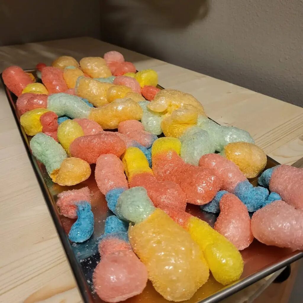 “Skittles and Jolly Ranchers are the big products that everybody goes crazy over. The Jolly Ranchers get like golf ball size,” Burkett said. “You bite into it like an apple. It has a crunchy texture, and the flavor is way more potent. … The Trolli gummy worms almost turn into a Cheetos texture with a little chewy center.”