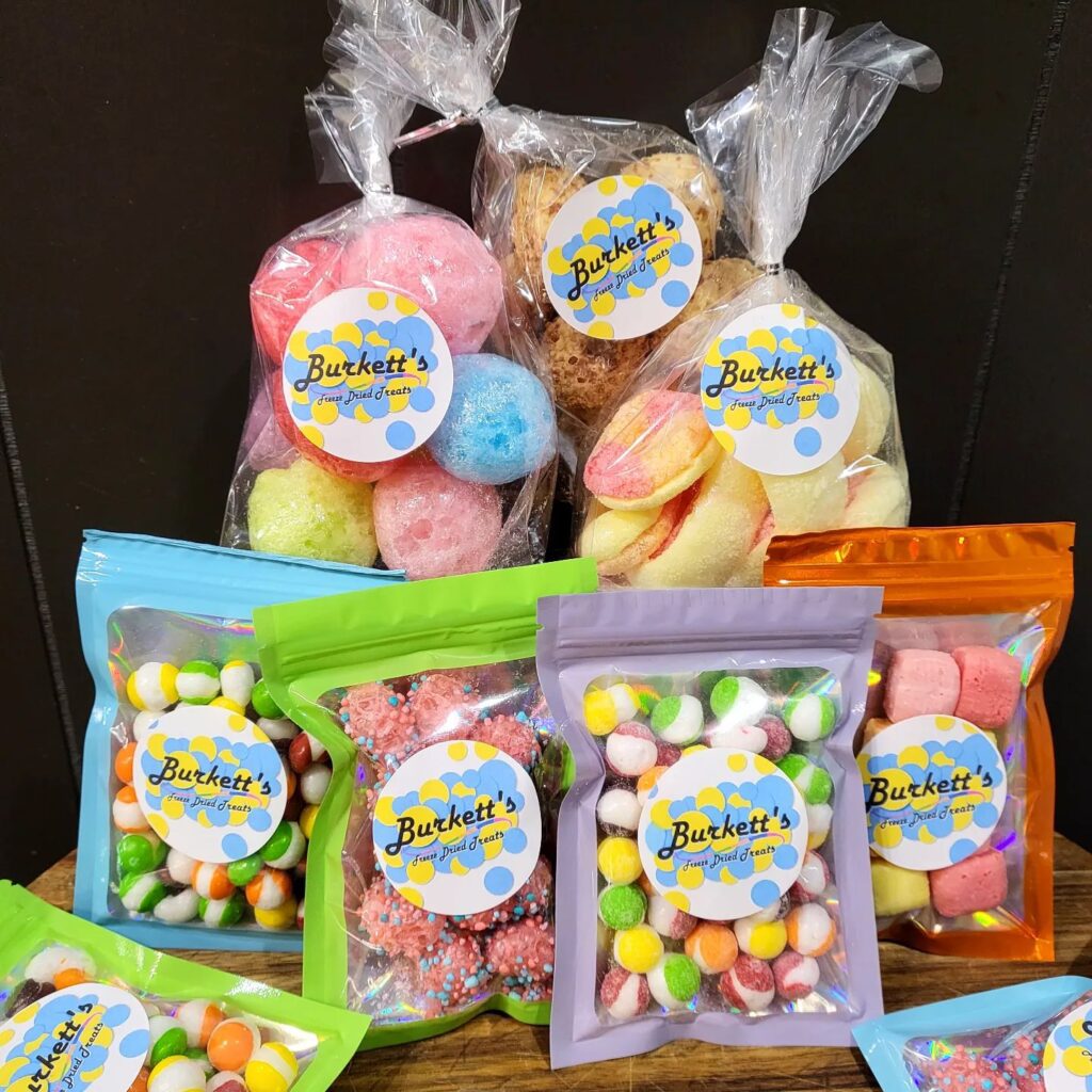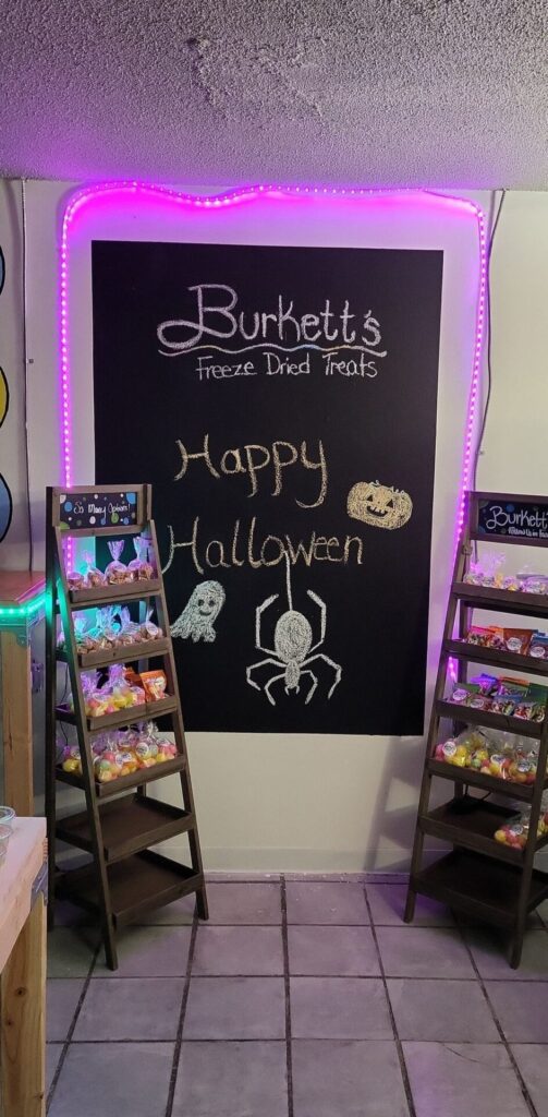 Last week, Burkett’s Freeze Dried Treats opened as a store-within-a-store in Watecha Bowl at 2305 W. Madison St. Other retailers also carry a few treats, including The Gas Barrel nearby, Westside Glass Emporium on Marion Road and a flower shop owned by a friend in Hawarden, Iowa. The couple also will be busy in the coming weeks with holiday-themed vendor shows.