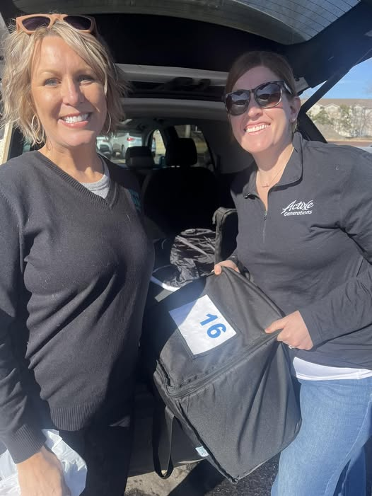 Active Generations board member Stacy Wrightsman of Maguire and CEO and president Betsy Schuster volunteer their time to deliver meals.