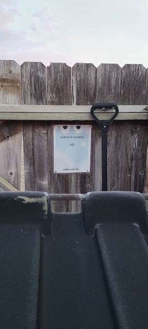 Thinking it’s a different approach to a security sign? “God is watching you … and so are we.”
