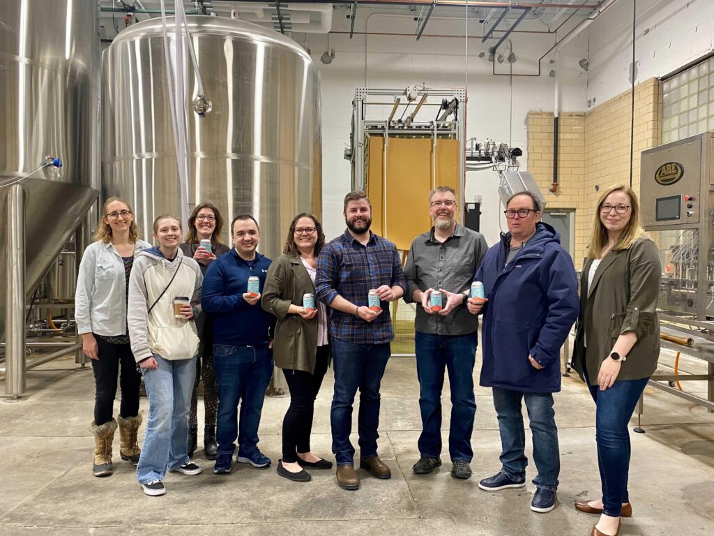 A group of MarketBeat employees at Remedy Brewing Co. with MarketBrew in hand.
