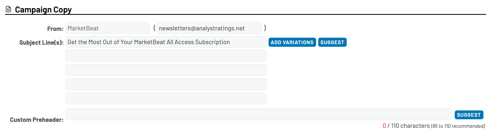 MarketBeat’s campaign editor features an AI-powered “suggest” button to generate subject line ideas.