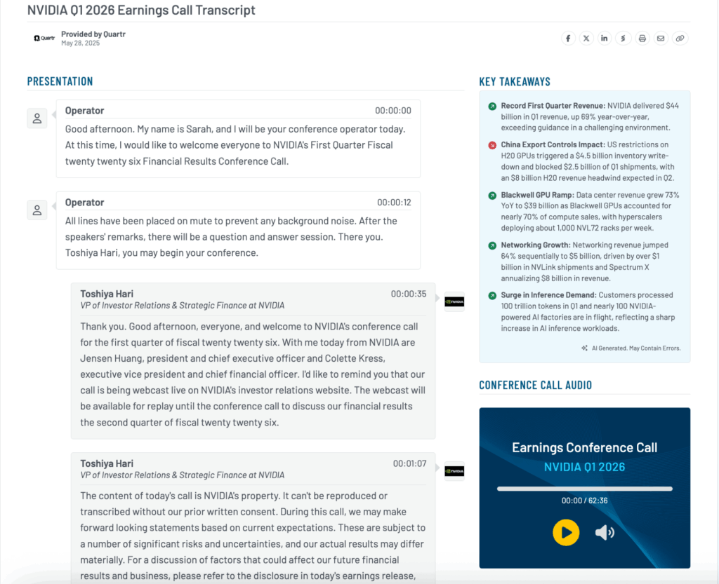 Earnings calls, which often can run for an hour or more, now are summarized using AI as well. The tool extracts key takeaways and organizes them by tone, offering a snapshot of the most important points from each call. These summaries typically are available within the same day, making it easier for users to stay up to date during reporting season.