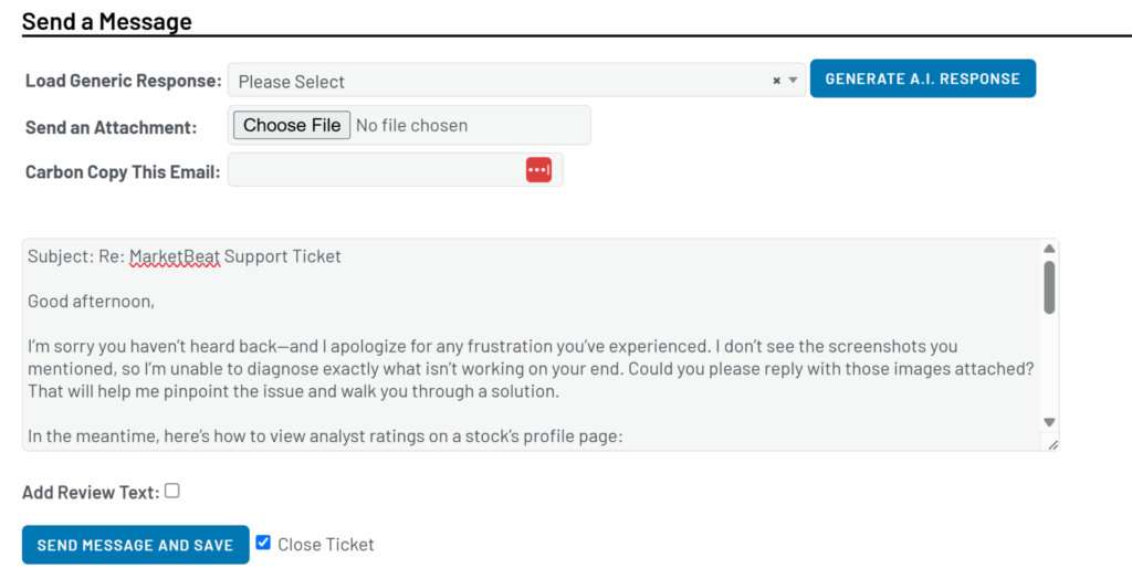 MarketBeat’s customer service portal generates AI-drafted responses.