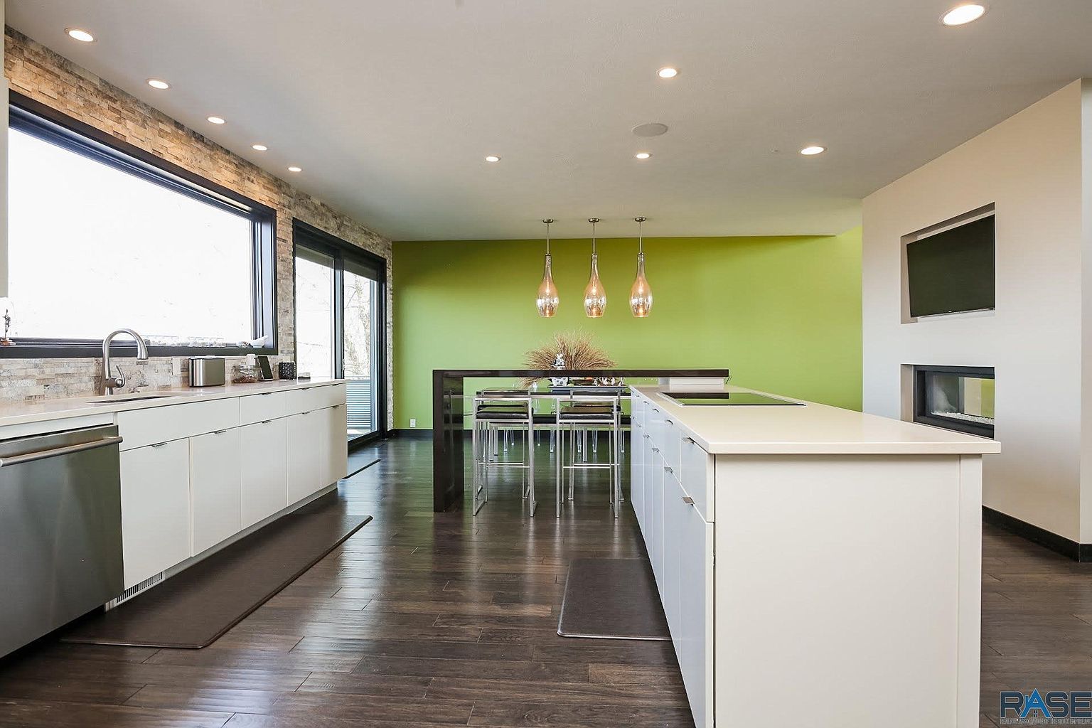The sleek kitchen features a massive center island with an induction cooktop.