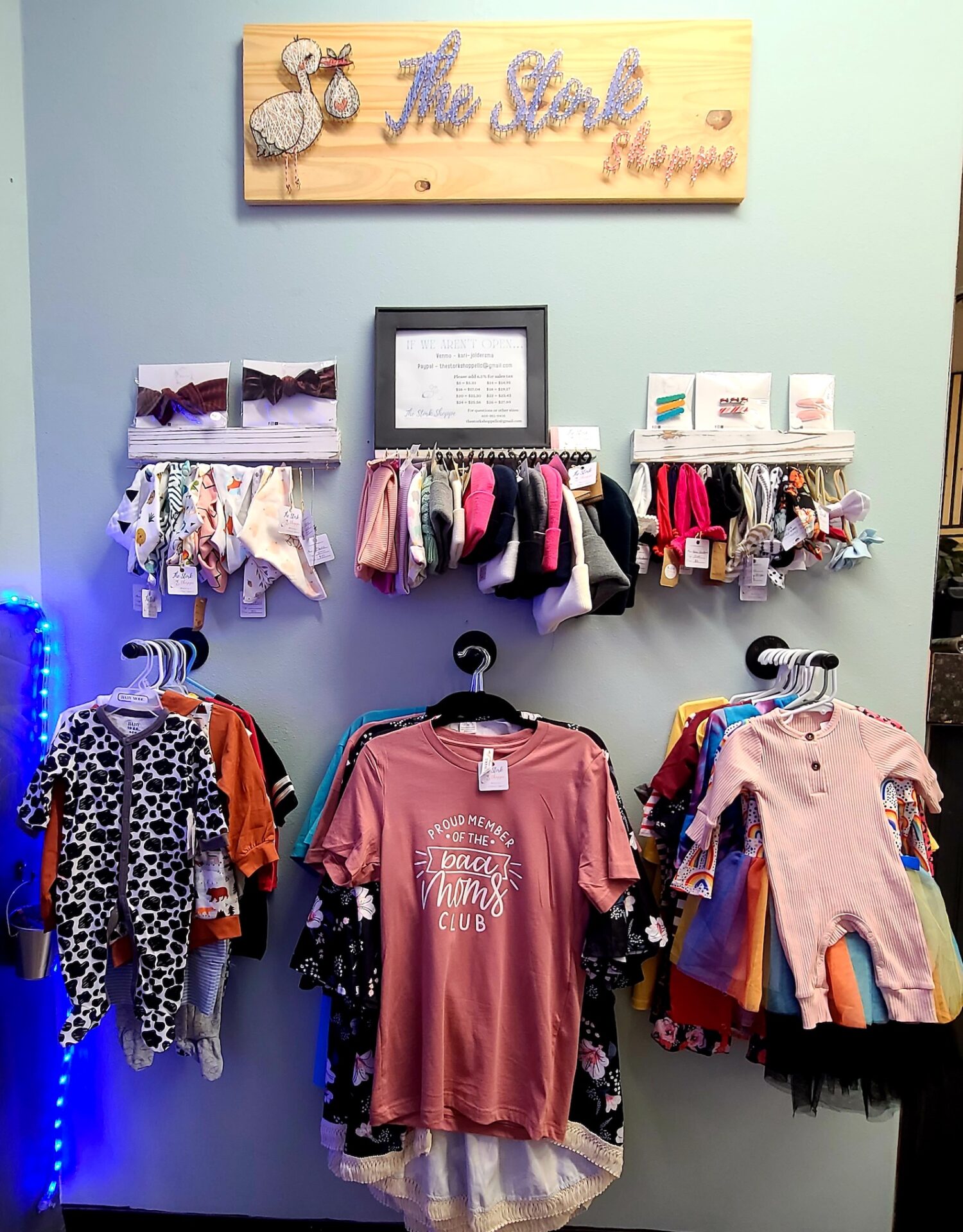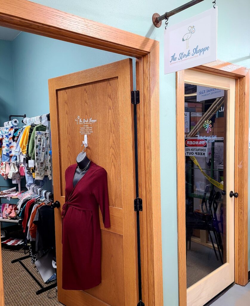 The Stork Shoppe carries a wide array of maternity clothing, from jeans and dresses to nursing-friendly tops as well as children’s clothing from preemie to size 8. There also are handmade accessories from area maker moms. The business partners with a maternity manufacturer on custom-designed clothes and locally prints onesies, shirts and dresses custom for the store.