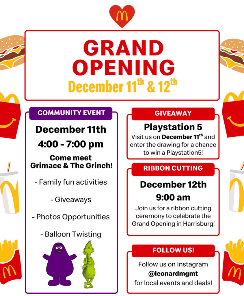 Grand-opening events will be Thursday and Friday, including an appearance by Grimace and the Grinch.