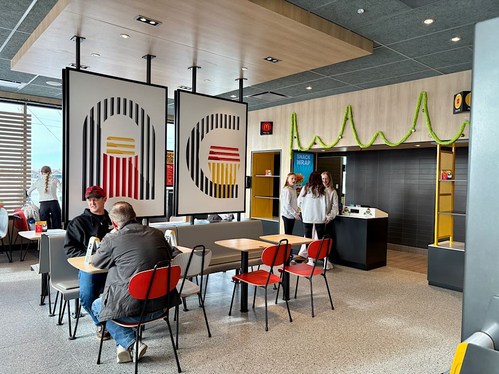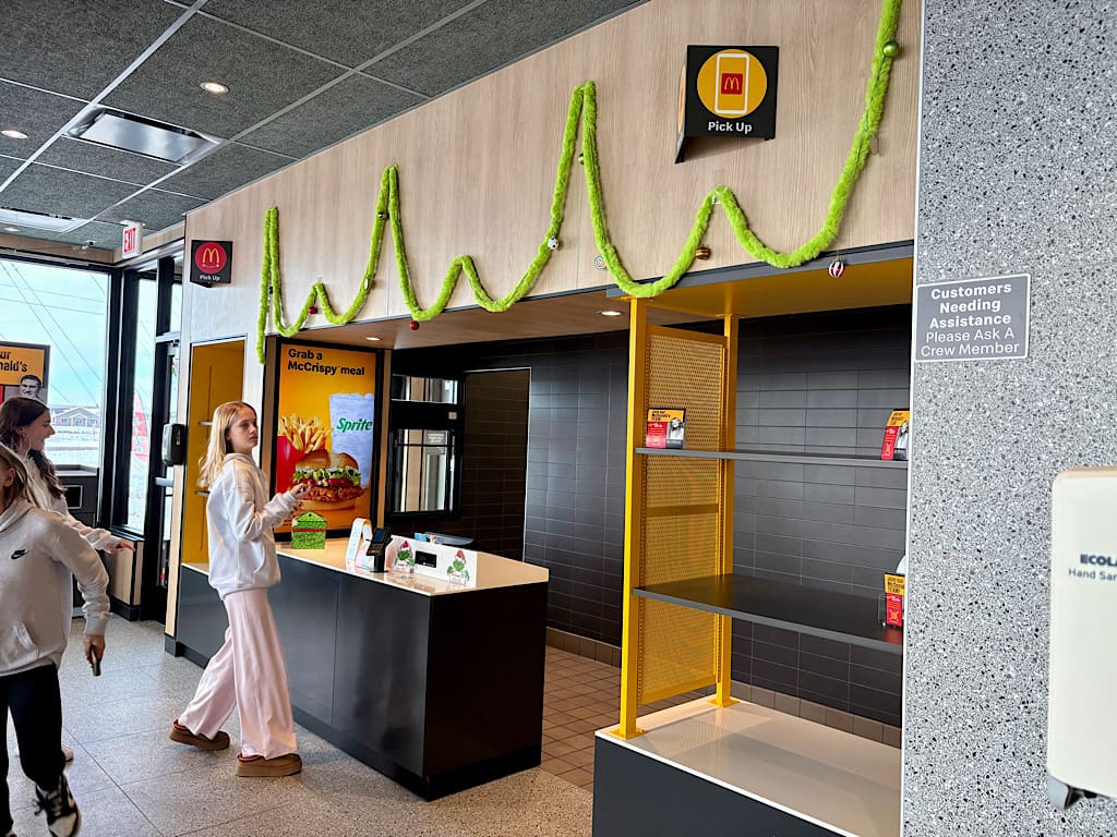 The restaurant features a double-lane drive-thru, kiosk and counter ordering, seating inside and pickup options inside and outside for mobile orders.