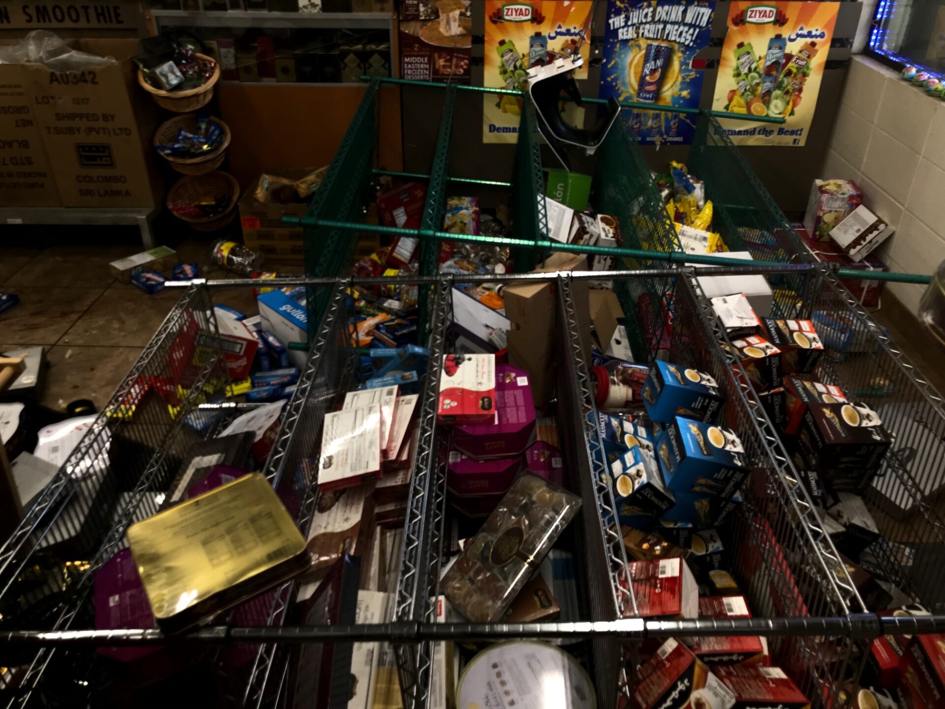 Display racks were knocked over, cans and boxes swept off shelves and bags of potato chips left in an untidy heap.