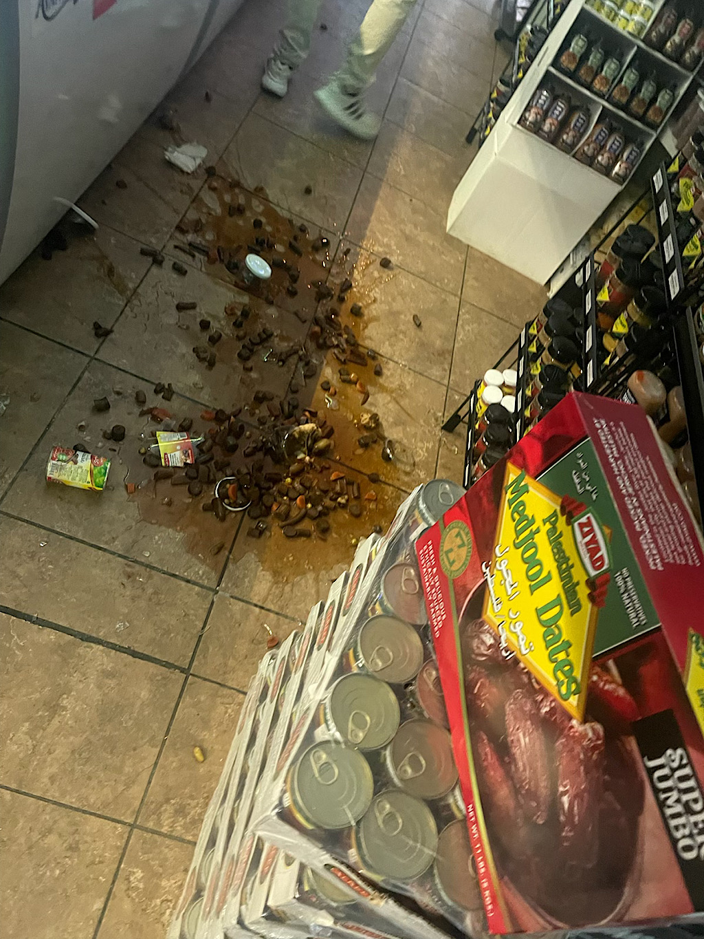 The vandal or vandals left behind broken jars of olives and a floor flowing with red liquid from destroyed decanters.