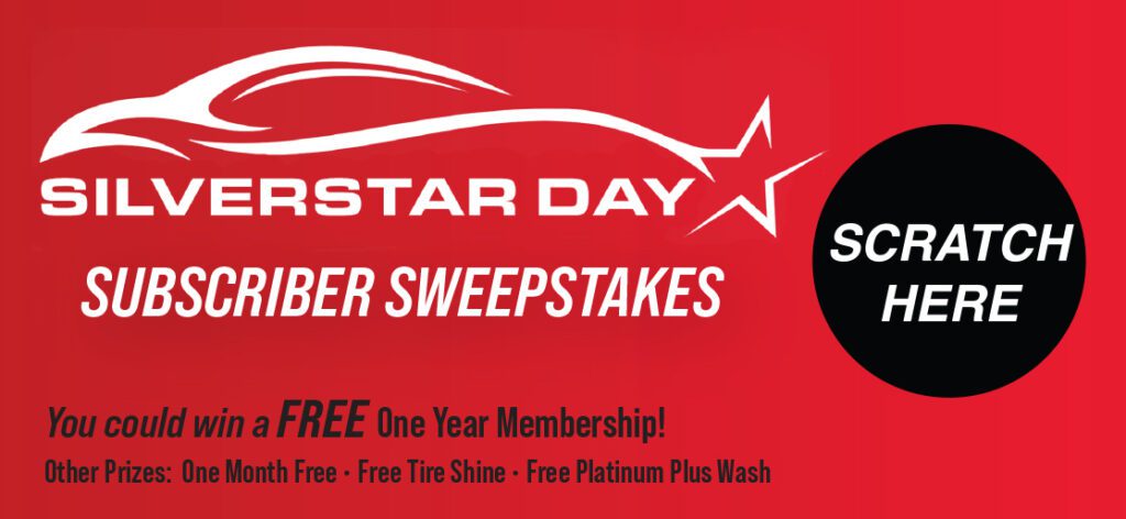 Silverstar members, you’ll definitely want to bring your vehicle through the wash Sept. 27. When you do, you’ll receive a scratch ticket that could lead to some sweet prizes, including a free membership for a year. This offer is good at any Silverstar location in any state.