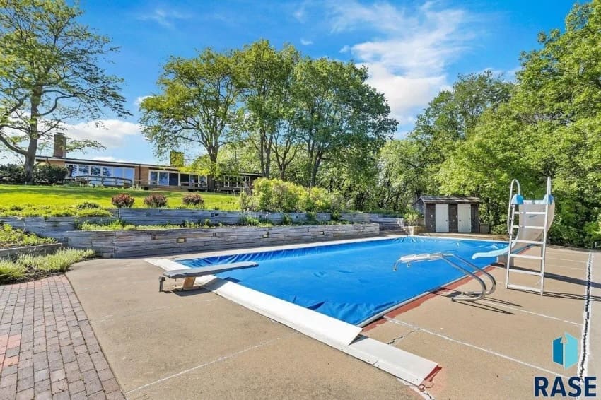 The midcentury ranch home was built in 1961 and sits on 7.5 tree-filled acres. The 4,300-square-foot home has five bedrooms and four bathrooms. Features include an in-ground pool and two outbuildings.