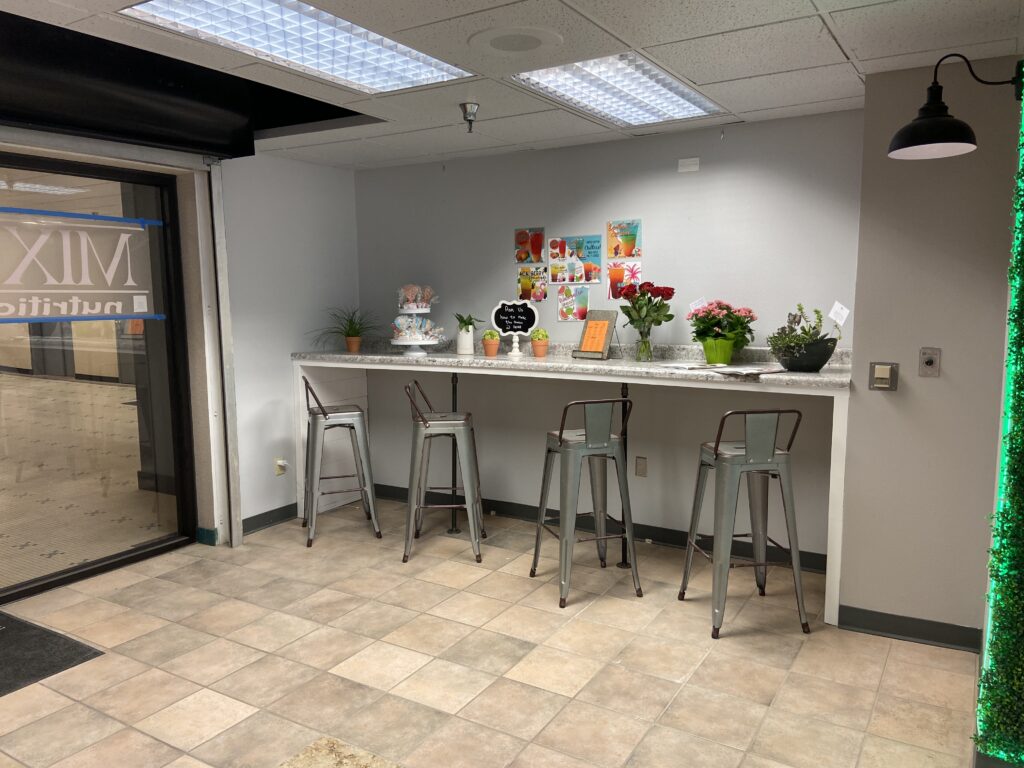 Mixx has space for seating, including a couch and chairs that flank an ivy wall with a neon Mixx DTSF sign, and some bar-style seating near the back.