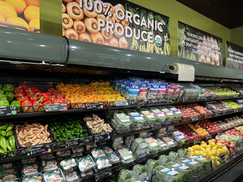 The store sells 100 percent USDA-certified organic produce, high-quality organic and natural groceries, 100 percent free-range eggs, 100 percent pasture-based dairy, 100 percent non-GMO prepackaged bulk goods, dietary supplements, body care products and household essentials.