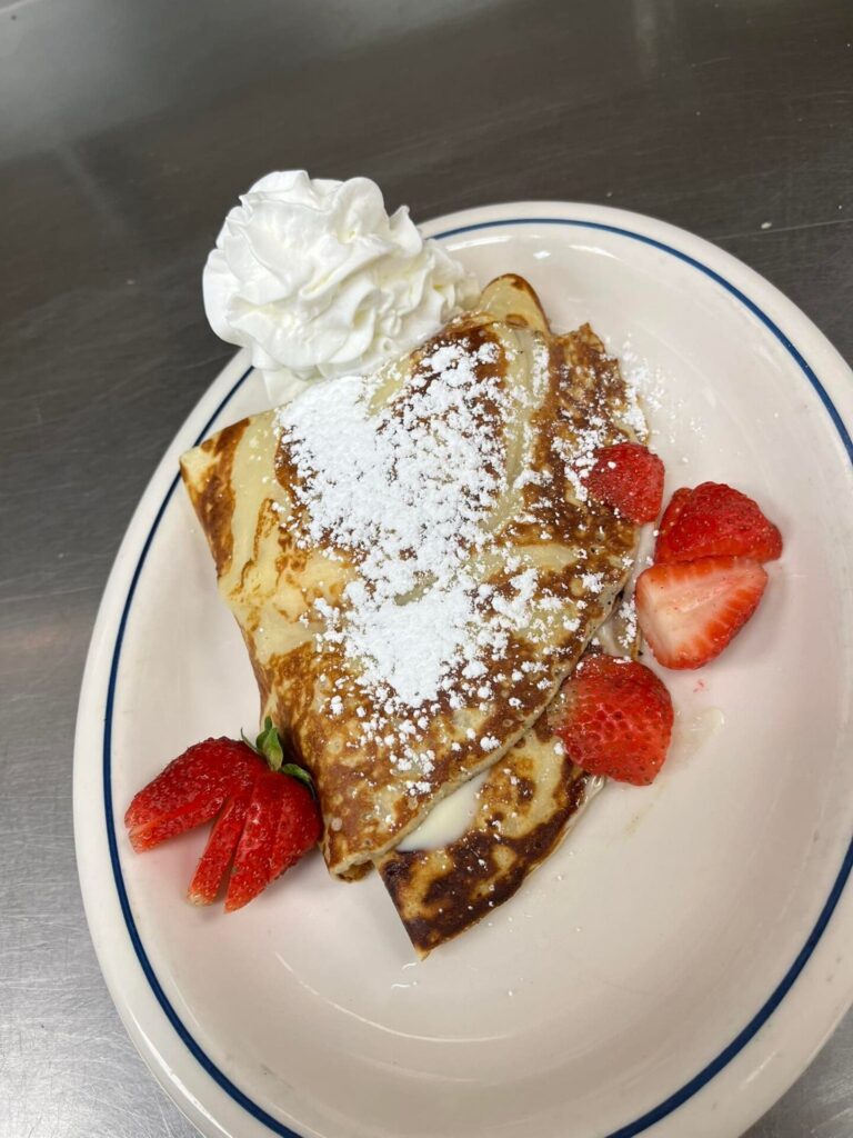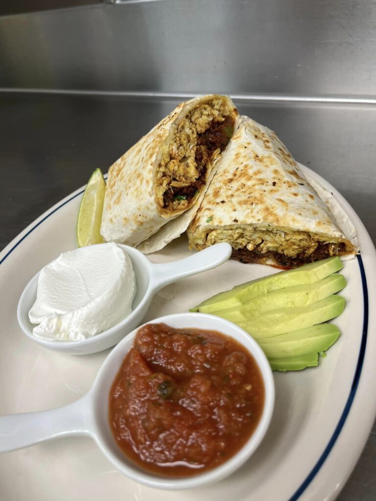 For breakfast, she offers a strawberries and cream crepe; a sandwich on a choice of bread with sausage or bacon, a fried egg and cheese; a burrito with chorizo, eggs, peppers, onion, cilantro, avocado, sour cream and salsa; avocado toast;, caramel apple French toast; and a lox bagel.