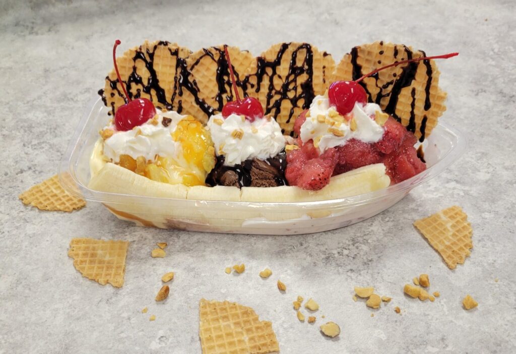 Along with classic treats like a banana split, Sweet Scoops’ menu includes several original creations. Topped with whipped cream and a cherry on top, the Nacho Sundae features two scoops of ice cream, waffle cone chips and a choice of sauces and toppings.